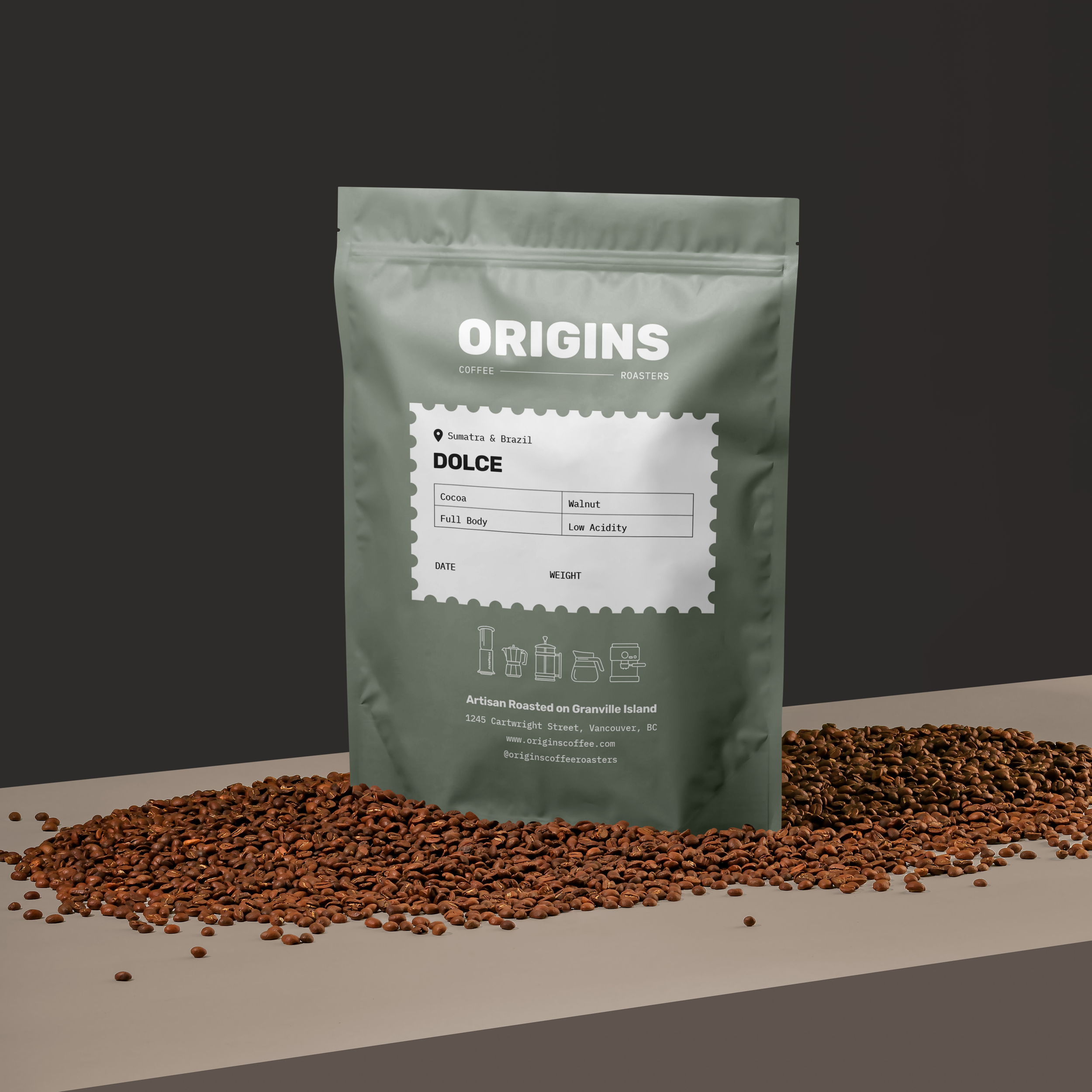 Brand identity and packaging design for Origins Coffee Roasters, an award-winning coffee roaster based in Vancouver, BC.