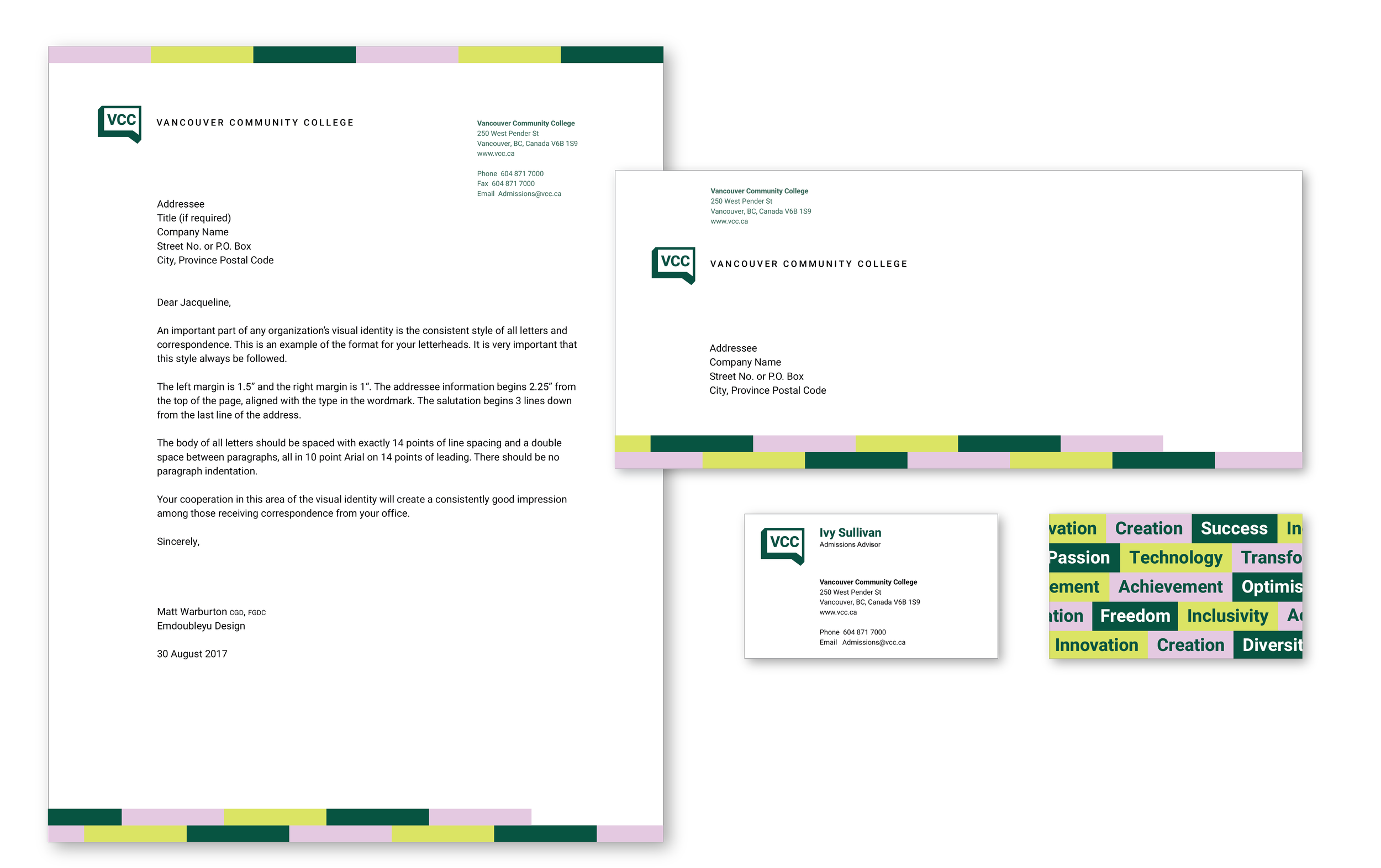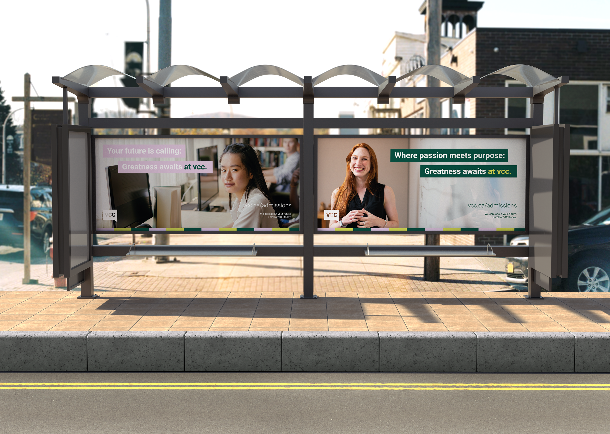 The goal of this rebrand was to create a visual identity for VCC that would make them appeal to a new target demographic. By creating a look for the college that is bold, modern, and exciting, this rebrand aims to remind people that college is exciting and fun, rather than simply a means to an end.